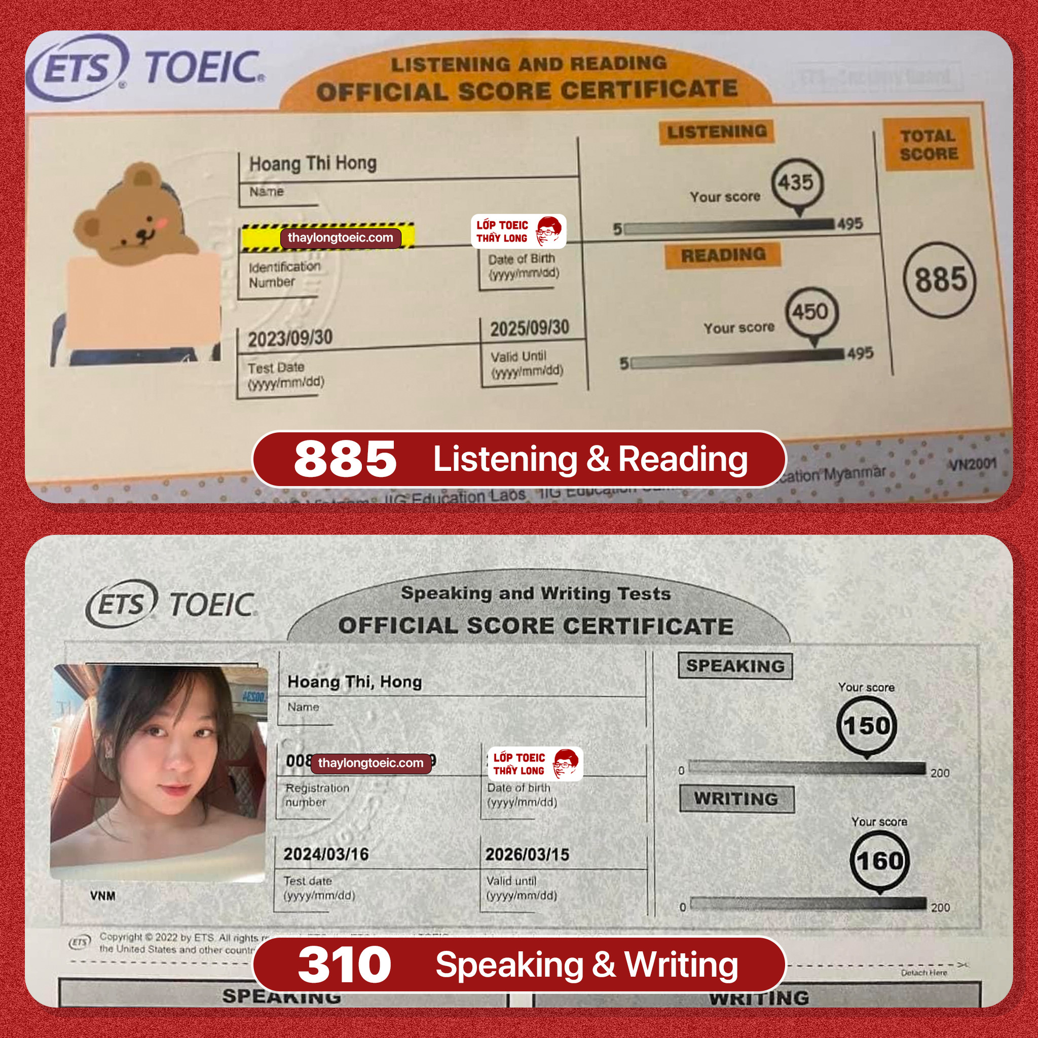Hoang Thi Hong 150 Speaking 160 Writing 885 TOEIC 16/03/2024
