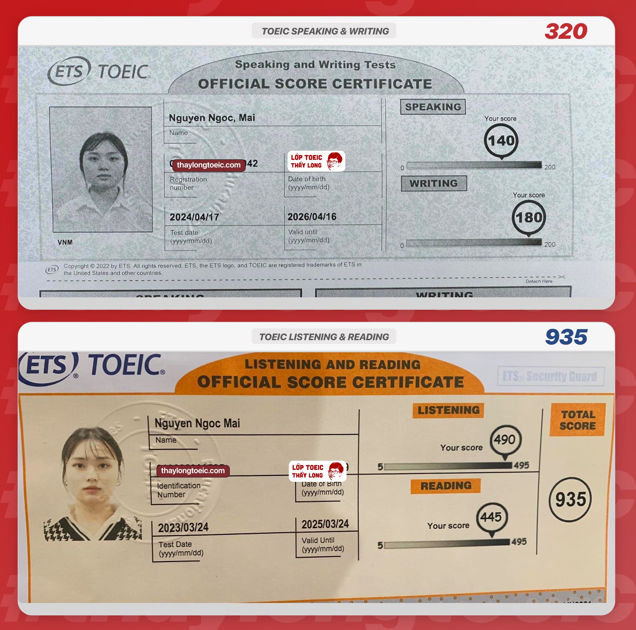 Nguyen Ngoc Mai 140 Speaking 180 Writing 935 TOEIC 17/04/2024