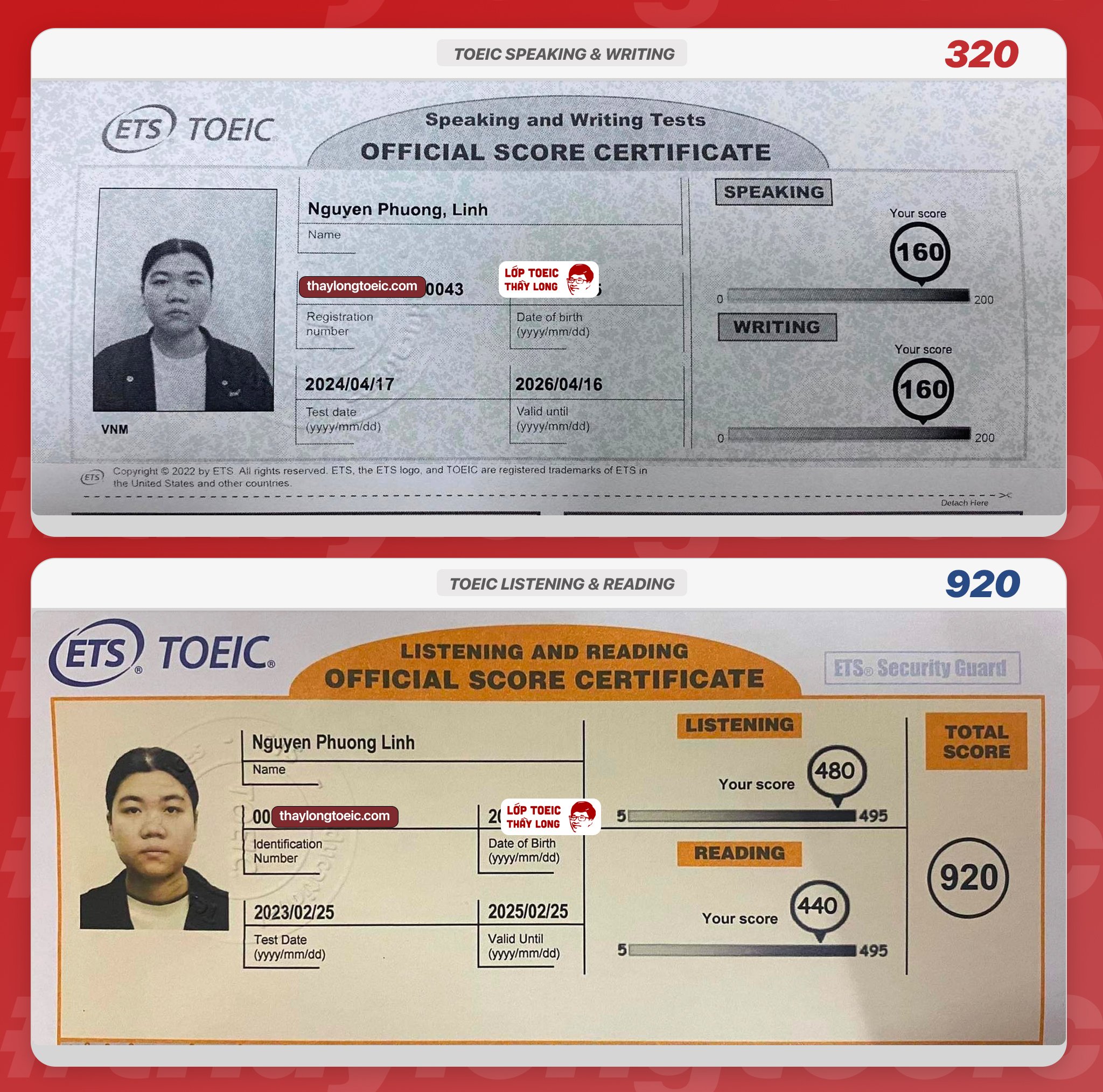 Nguyen Phuong Linh 160 Speaking 160 Writing 920 TOEIC 17/04/2024