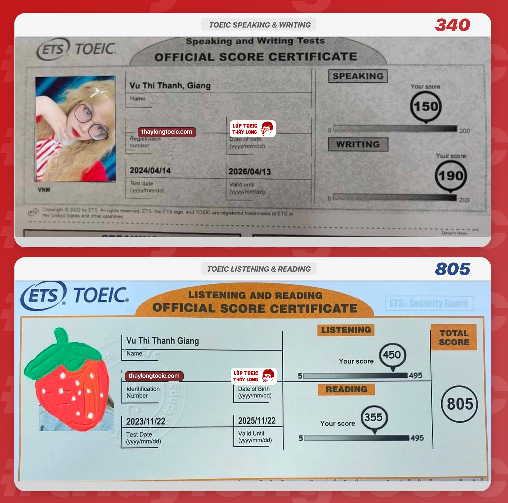 Vu Thi Thanh Giang 150 Speaking 190 Writing 805 TOEIC 14/04/2024