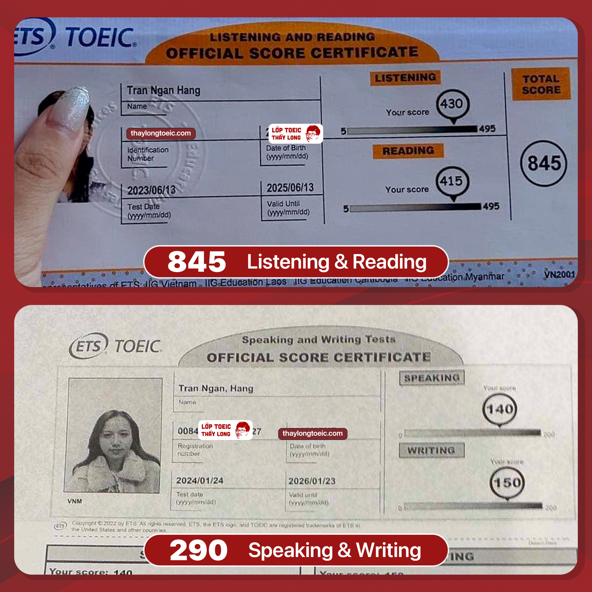 Tran Ngan Hang 140 Speaking 150 Writing 845 TOEIC 24/01/2024