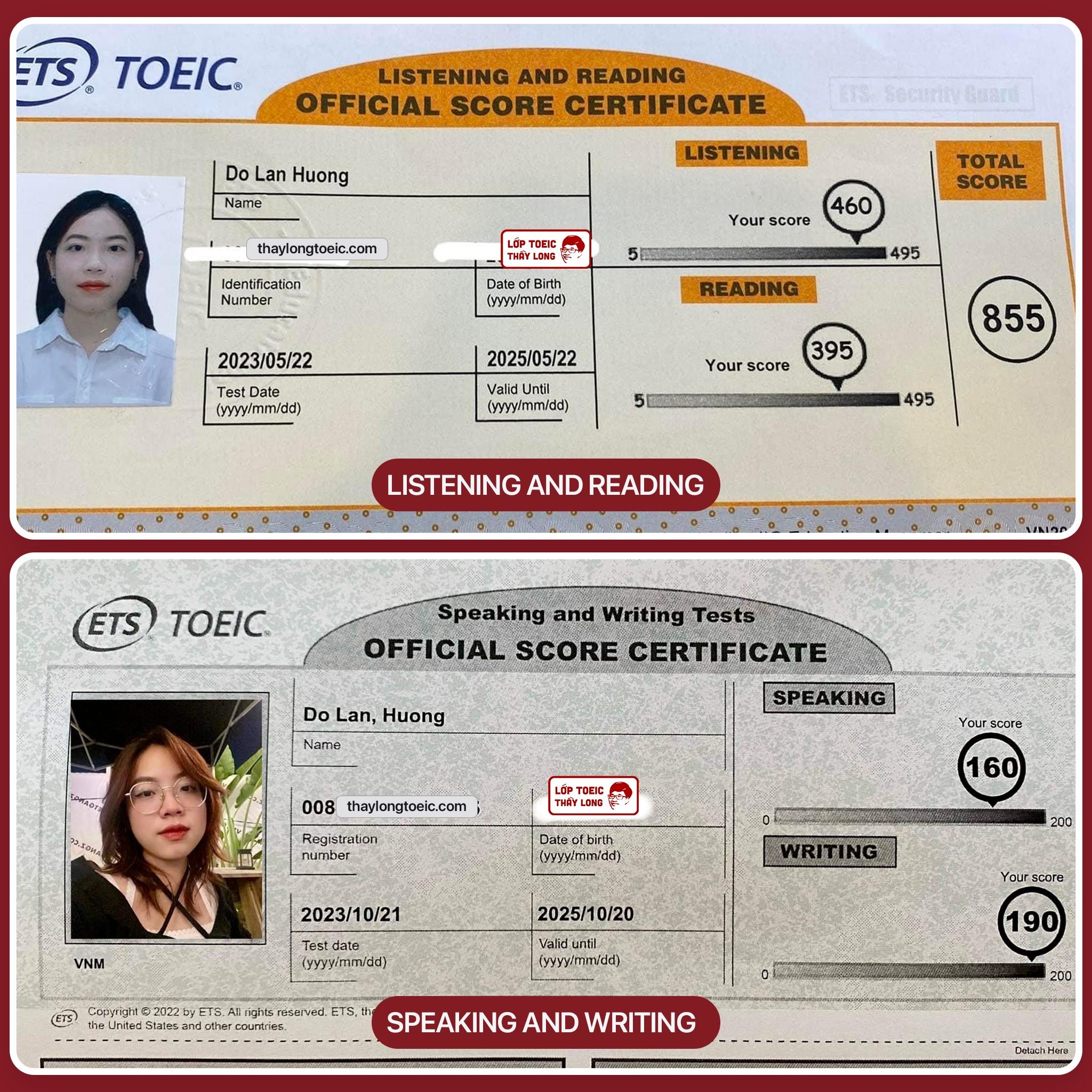 Do Lan Huong 160 Speaking 190 Writing 855 TOEIC 21/10/2023