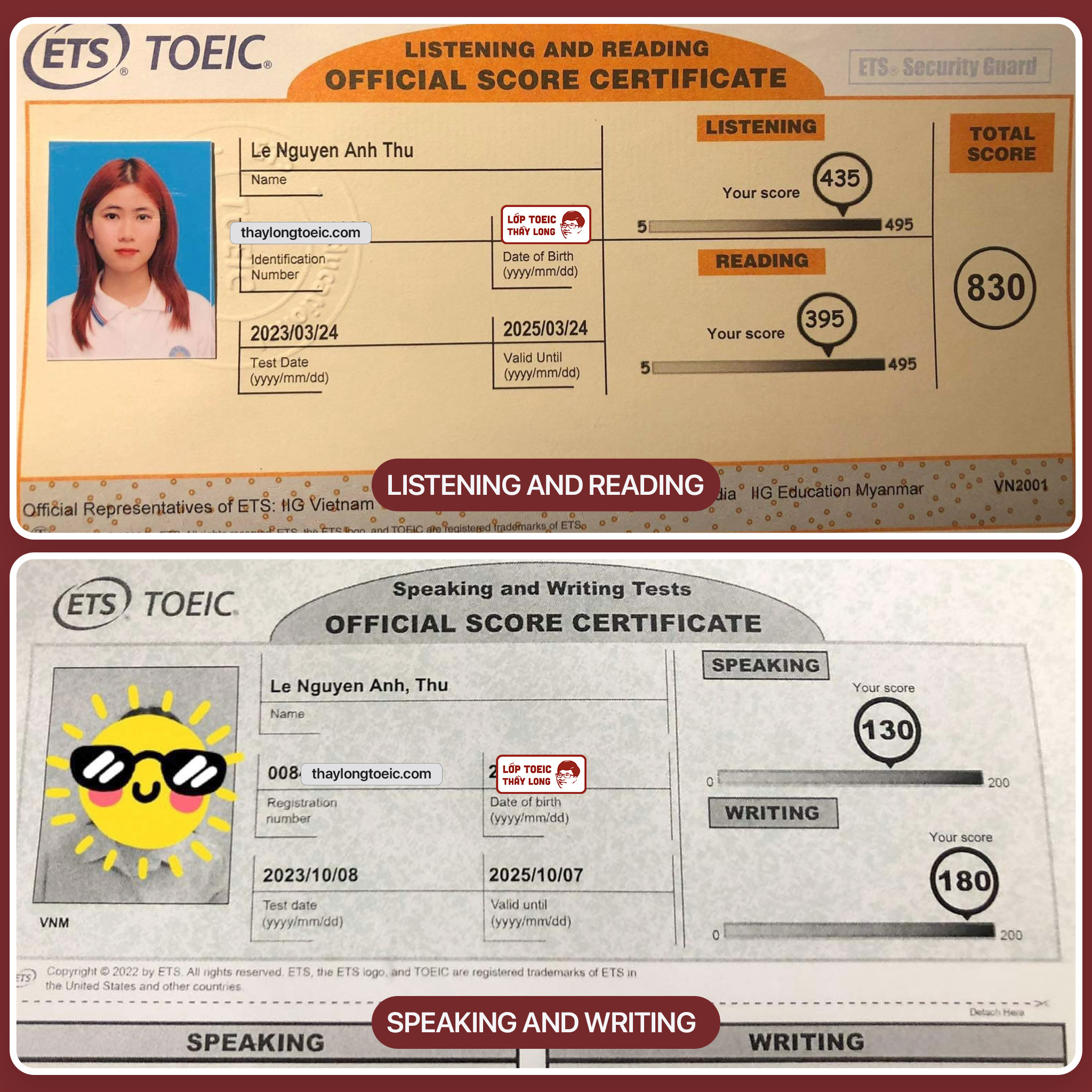 Le Nguyen Anh Thu 130 Speaking 180 Writing 830 TOEIC 08/10/2023