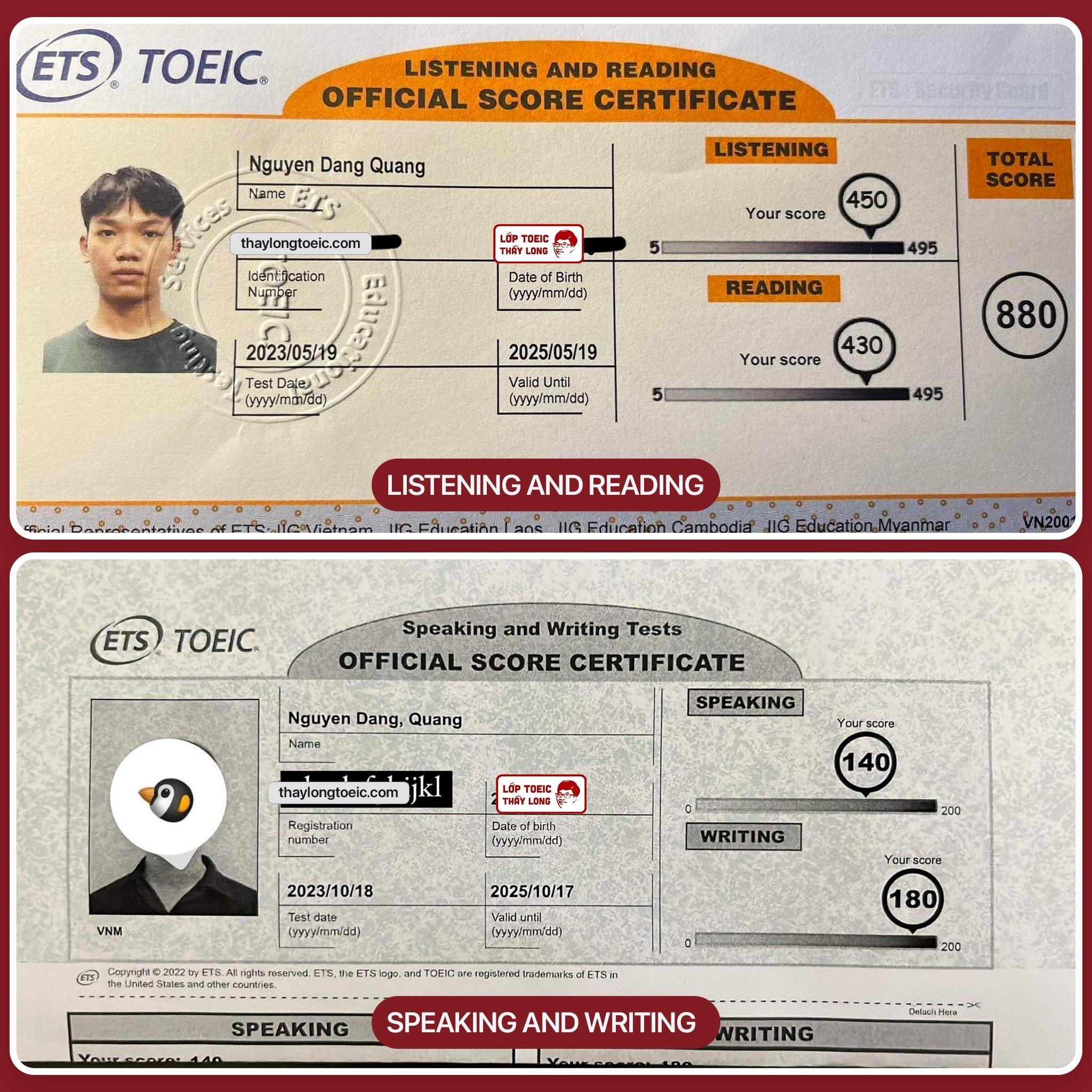 Nguyen Dang Quang 140 Speaking 180 Writing 880 TOEIC 18/10/2023