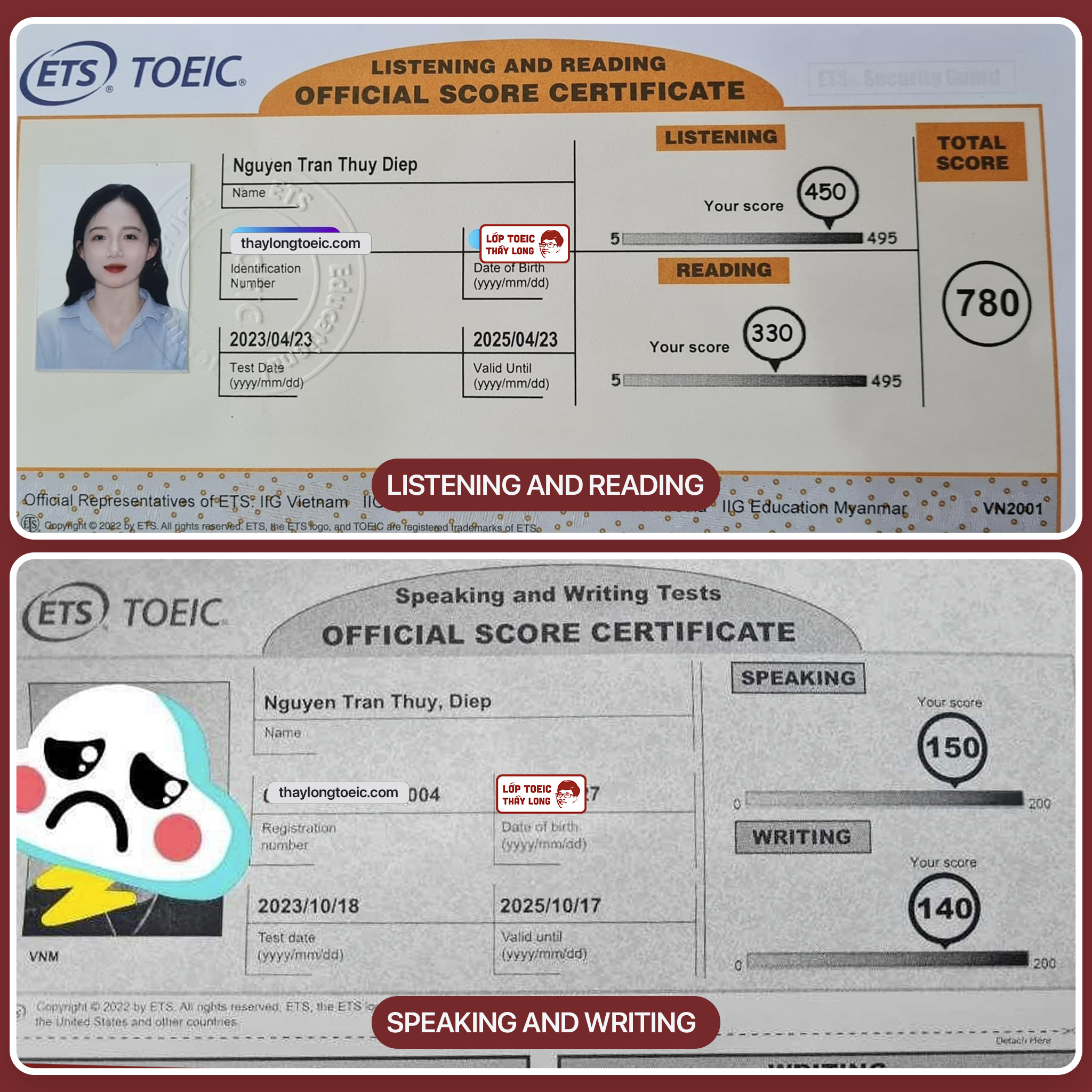 Nguyen Tran Thuy Diep 150 Speaking 140 Writing 780 TOEIC 18/10/2023