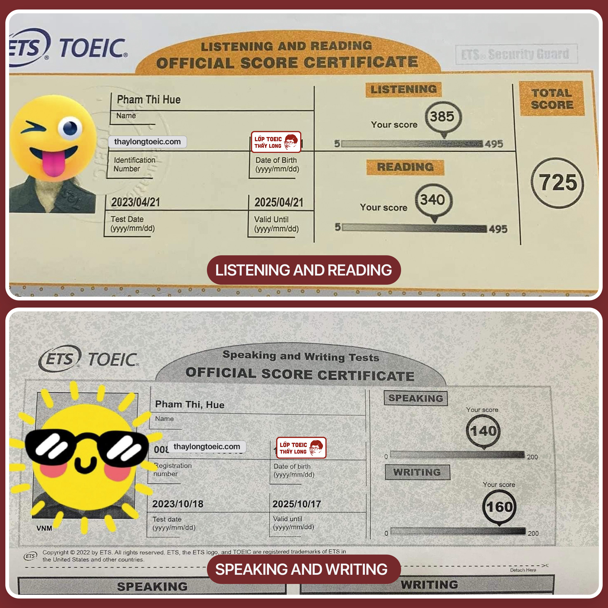 Pham Thi Hue 140 Speaking 160 Writing 725 TOEIC 18/10/2023
