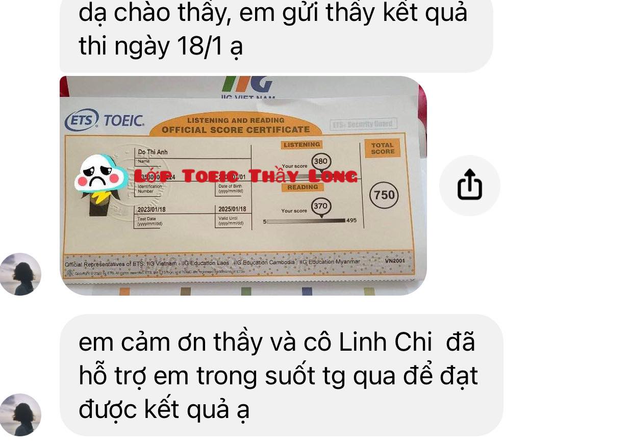 Chúc mừng em với kết quả rất tốt sau lớp TOEIC A nhé