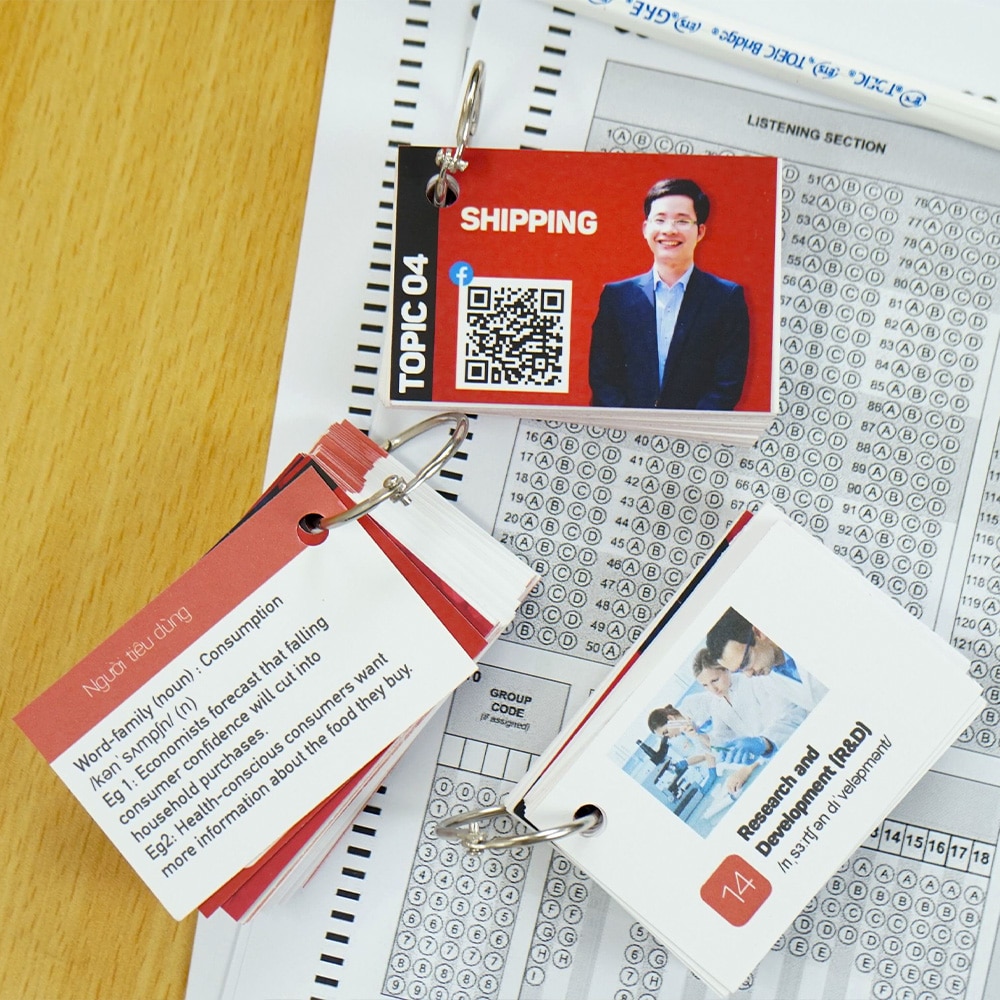 Bên cạnh đó, ngoài tài liệu được cung cấp trên lớp, học trò của Lớp TOEIC thầy Long còn được học từ vựng thông qua bộ FLASHCARD sinh động và tiện lợi trong suốt quá trình học tập. Với thiết kế nhỏ gọn, bao gồm các chủ đề từ vựng sẽ có trong bài thi TOEIC, cùng phiên âm và ví dụ vô cùng dễ hiểu, giúp học viên tăng khả năng nhớ từ siêu cấp.